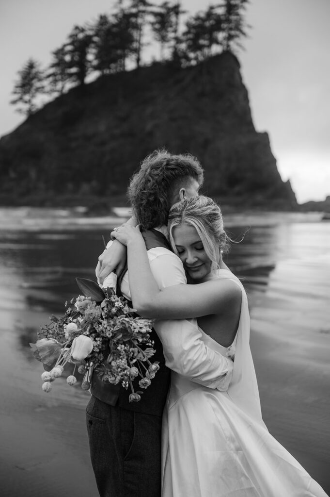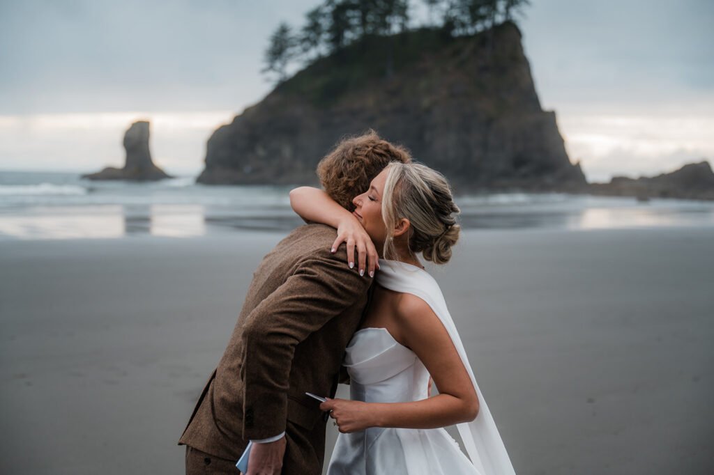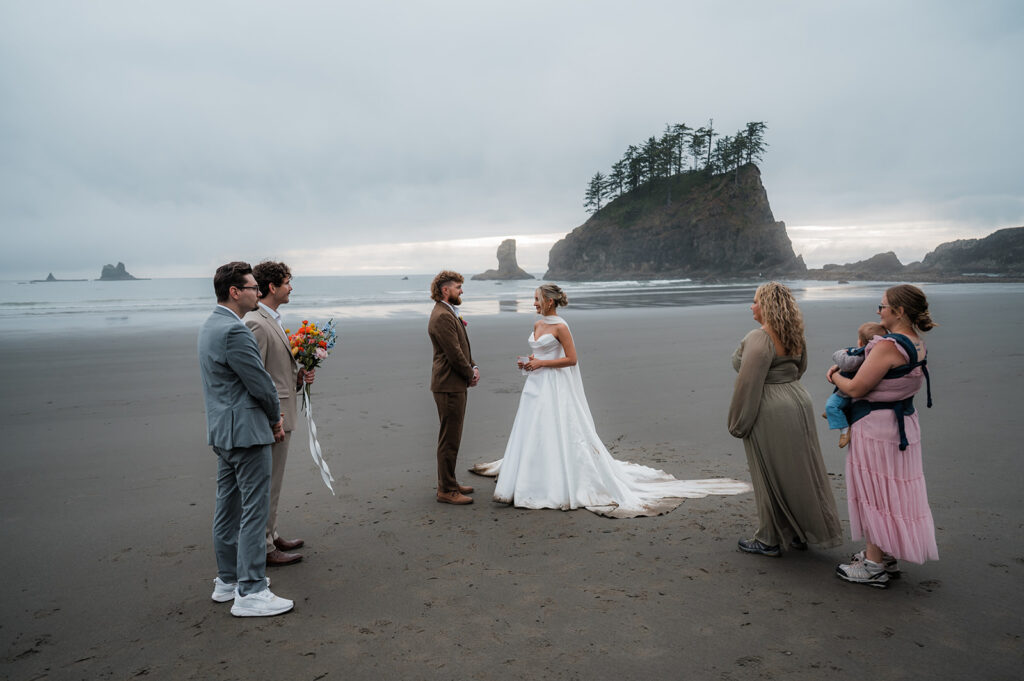 With the Pacific Ocean behind them and their closest friends and family gathered in a small circle, Ryan and Bailey exchanged vows. There were tears, big smiles, and that quiet kind of joy that fills the air when everything feels right. The waves crashed as they said “I do,” and it couldn’t have felt more fitting for a PNW elopement on the Olympic Peninsula.