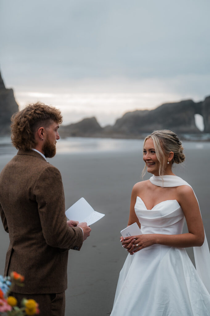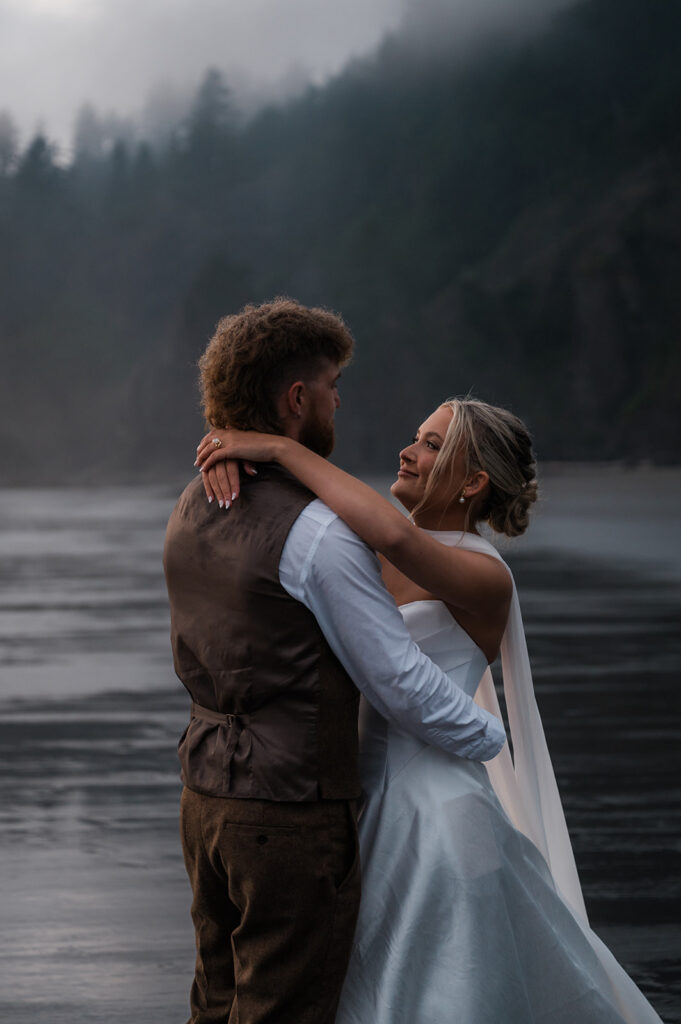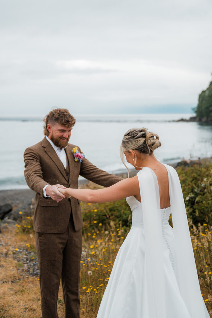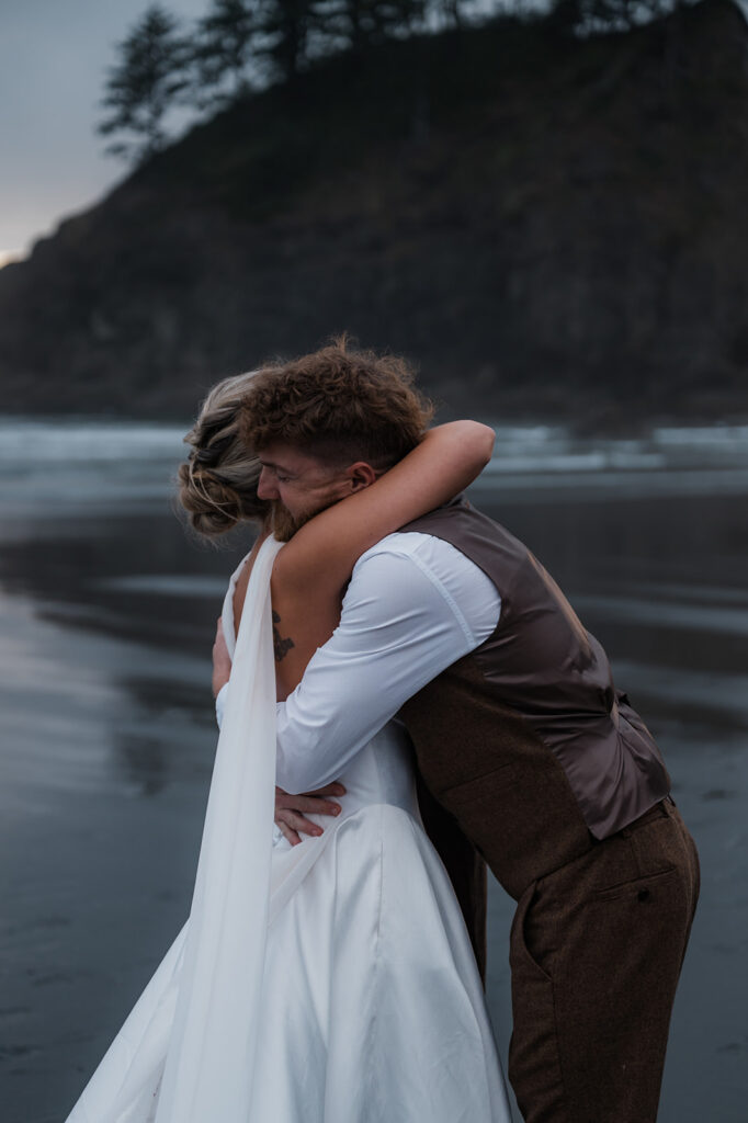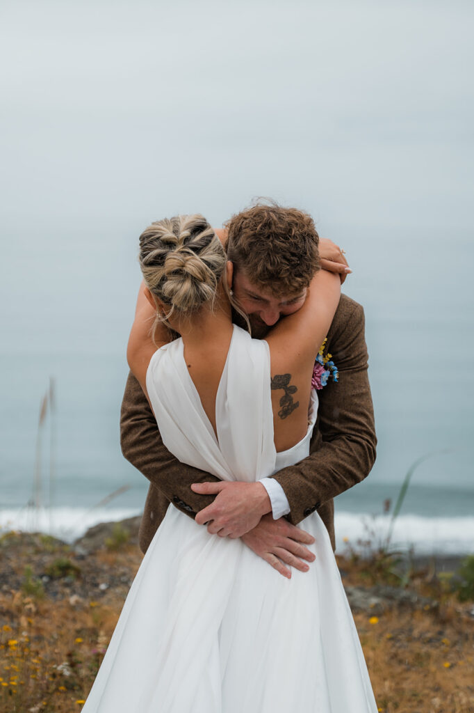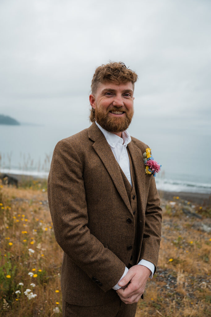 They started the morning getting ready near the Washington coast with their favorite people nearby. It felt relaxed and unrushed. Laughter filled the space while final touches came together. Before heading off for the day’s adventure, they shared a first look along the rugged coastline. The wind off the ocean, the quiet shoreline, and the soft light made it feel intimate and real.