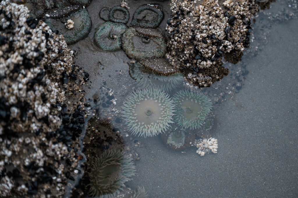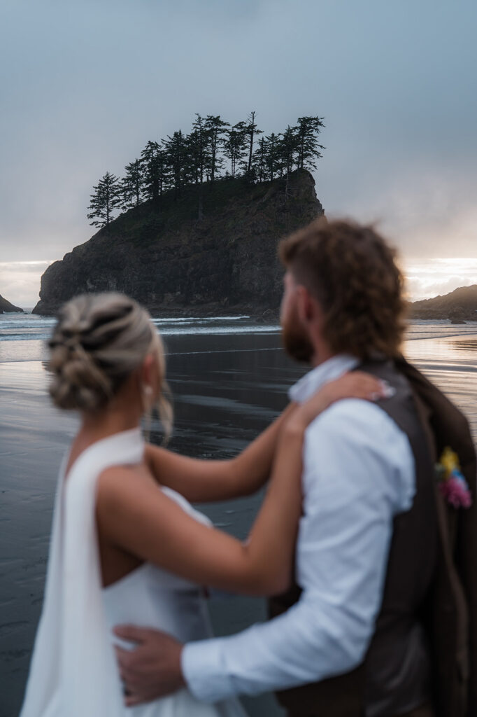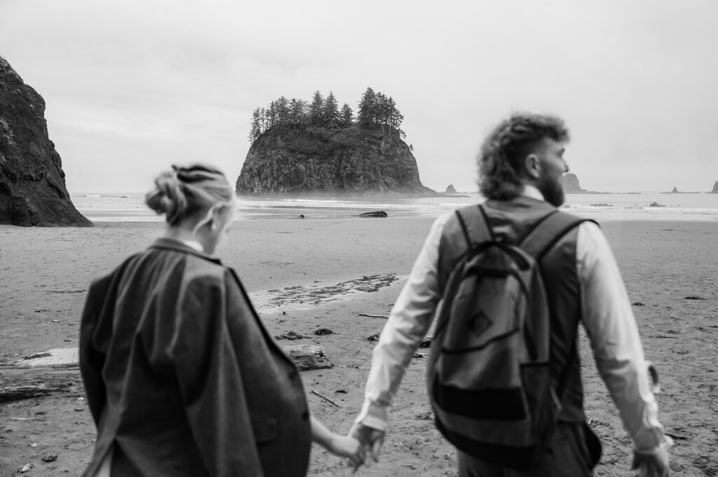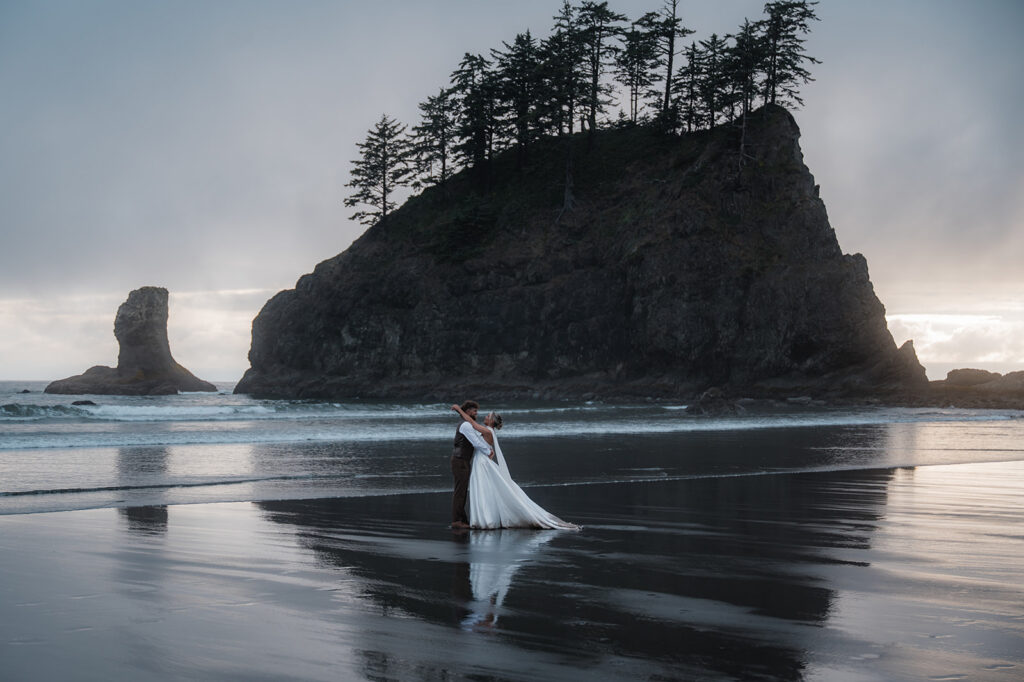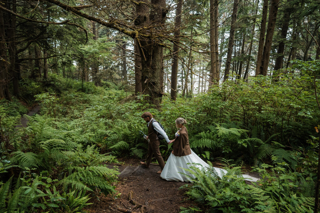 After wandering through the rainforest, we made our way back toward the coast and hiked down to Second Beach for their ceremony. The trail was lined with ferns and towering trees, opening up to dramatic sea stacks and crashing waves. The sky stayed beautifully overcast, giving the whole beach a soft, cinematic feel.