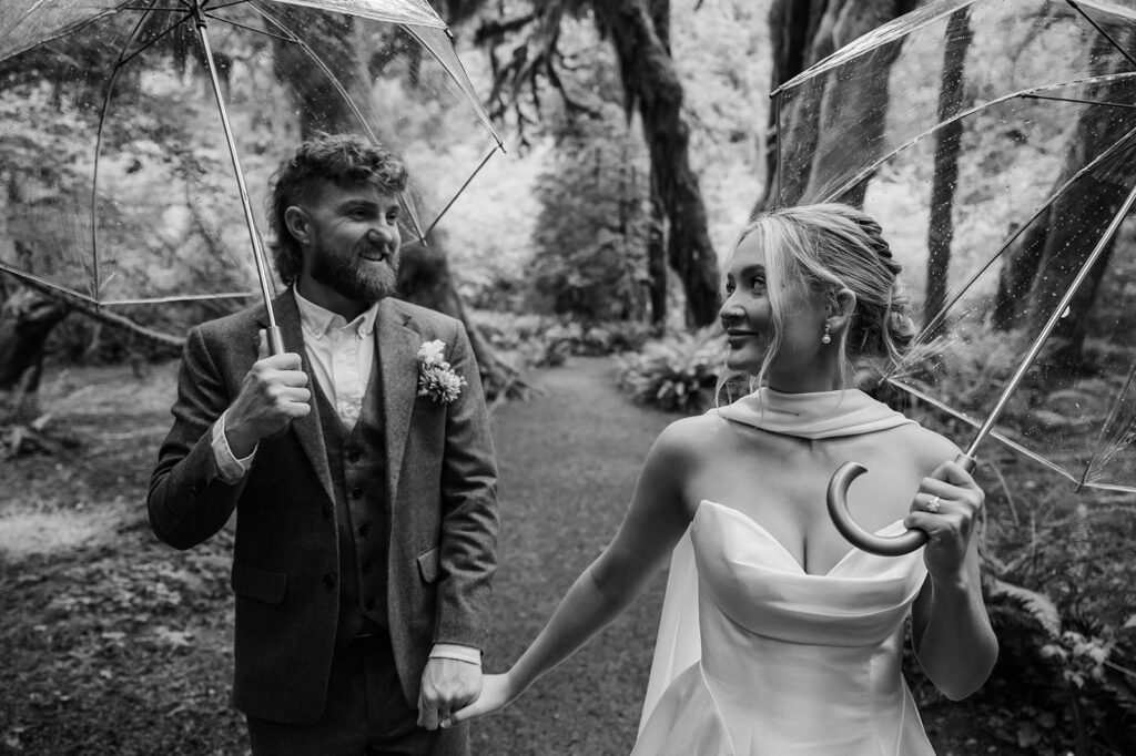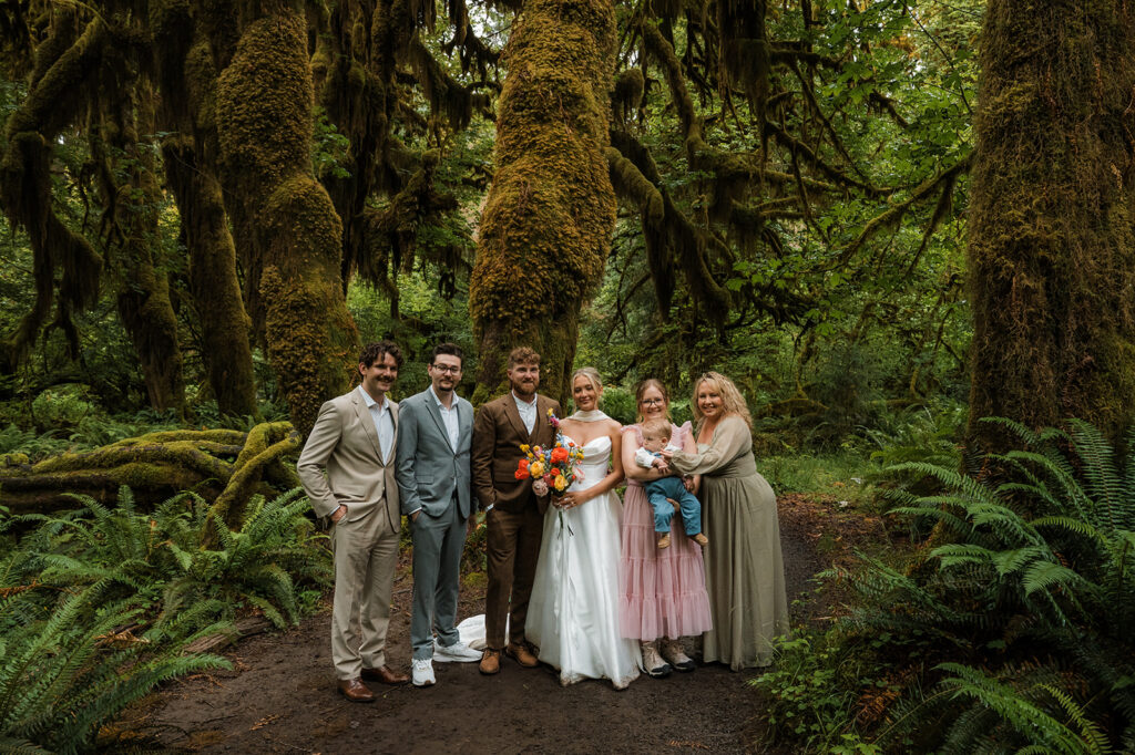 From there, we drove into the forest for the next part of their PNW elopement adventure — exploring the incredible Hoh Rainforest. The moss-covered trees, bright green ferns, and steady drizzle created the dreamiest atmosphere. The forest felt still and alive at the same time. Even with the rain, everyone embraced it. Umbrellas came out when needed, but most of the time they just leaned into the weather. That’s the magic of a PNW elopement — you don’t wait for perfect sunshine. You let the landscape do its thing.